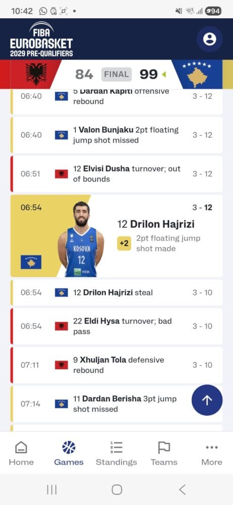 FOTO SCREENSHOT NGA STATISTIKAT ZYRTARE TE FIBA: Pikët i shënohen Drilon Hajrizit në vend se pika e dymbëdhjetë rresht e Dardan Berishës në start (3:12)