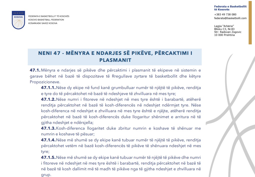 “47.1.4.Nëse më shumë se dy ekipe kanë tubuar numër të njëjtë të pikëve, renditja përcaktohet vetëm në bazë kosh-diferencës të pikëve të shënuara ndeshjet në mes tyre; “